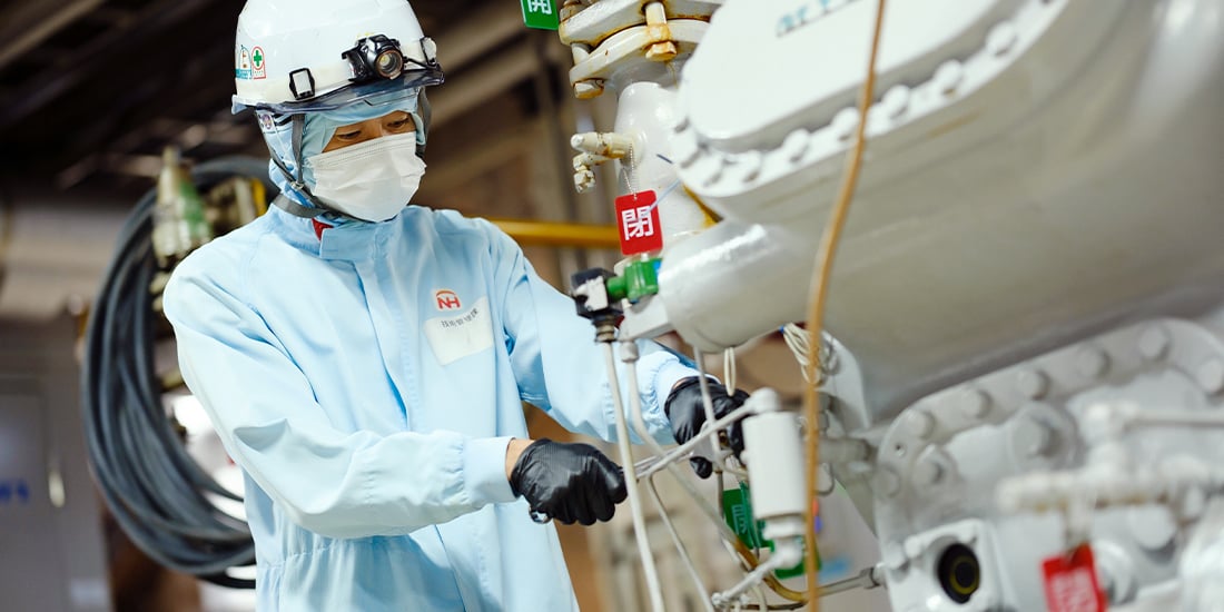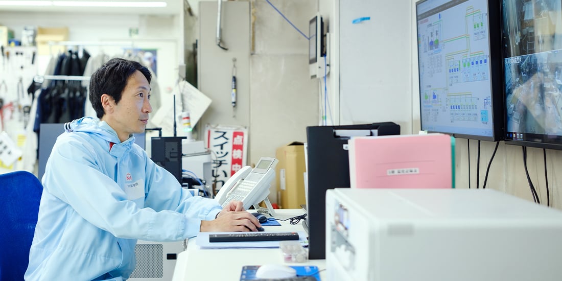 電気・ガス・水は製造に不可欠であり、止める訳にはいきません。その管理を任されている技術管理課ではその責任を日々感じながら保守業務にあたっています。また、工場の安全性、商品の信頼性は機械によって保たれている部分も大きく、その故障の予防や修理を行う際は、その後もきちんと動くよう想像して、細心の注意をもって業務にあたっています。