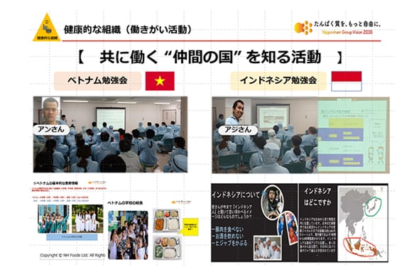 弊社ではベトナムからの技能実習生をはじめ、多くの外国籍従業員が活躍しています。コンプライアンスの基本である「リスペクト(尊重)」を実践するため、国籍や文化の垣根を越えた交流を積極的に行っています。食堂でのベトナム料理フェアの開催や、新しい仲間を歓迎するパーティーなど、インクルージョンをテーマに日常的なコミュニケーションを育み、職場環境づくりを進めています。