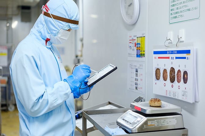現在は、ハンバーグを製造するラインを担当しており、原料肉をミンチ状にして混ぜ合わせるところから包装された製品を箱詰めするところまでの一連の工程を管理統括しております。